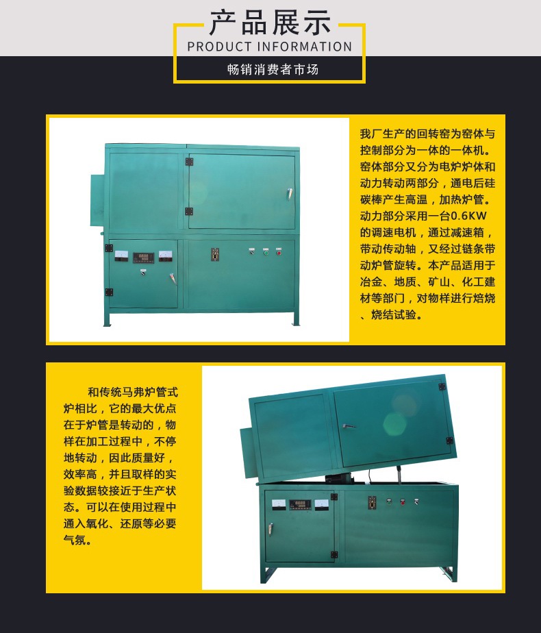實(shí)驗(yàn)室回轉(zhuǎn)窯分為兩部分。第一部分窯體,第二部分電器控制箱。窯體部分分為電爐爐體和動(dòng)力轉(zhuǎn)動(dòng)兩部分,爐體部分采用碳化硅圓形爐膛,沿四周繞高溫電爐絲,通電后加熱爐管。